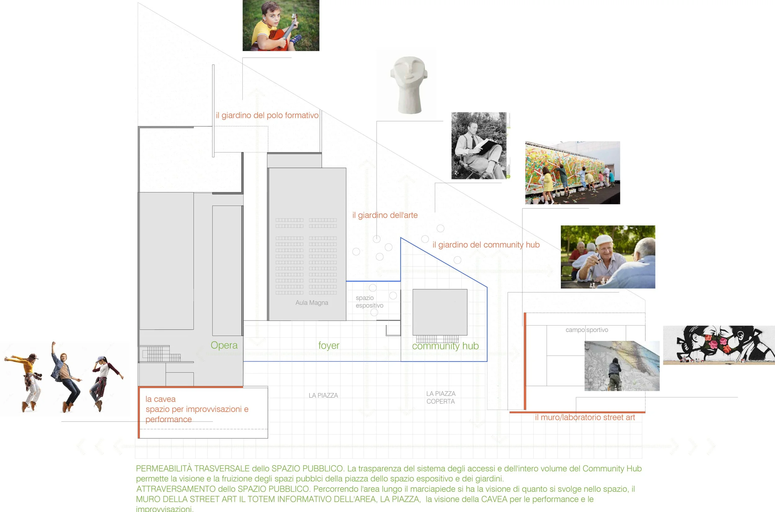 Il programma del concorso prevedeva la realizzazione di un Centro Culturale costituito da un Polo formativo del Teatro dell’Opera, un Community HUB e un “Nucleo delle Arti”, oltre a spazi dedicati ad attività sportive, andando a definire un edificio polifunzionale capace di rispondere alle esigenze della vita del quartiere, di diventarne un punto di riferimento, e nello stesso tempo, grazie alla qualità e alla rilevanza delle funzioni ospitate, rappresentare un servizio e un polo attrattivo per la città tutta.